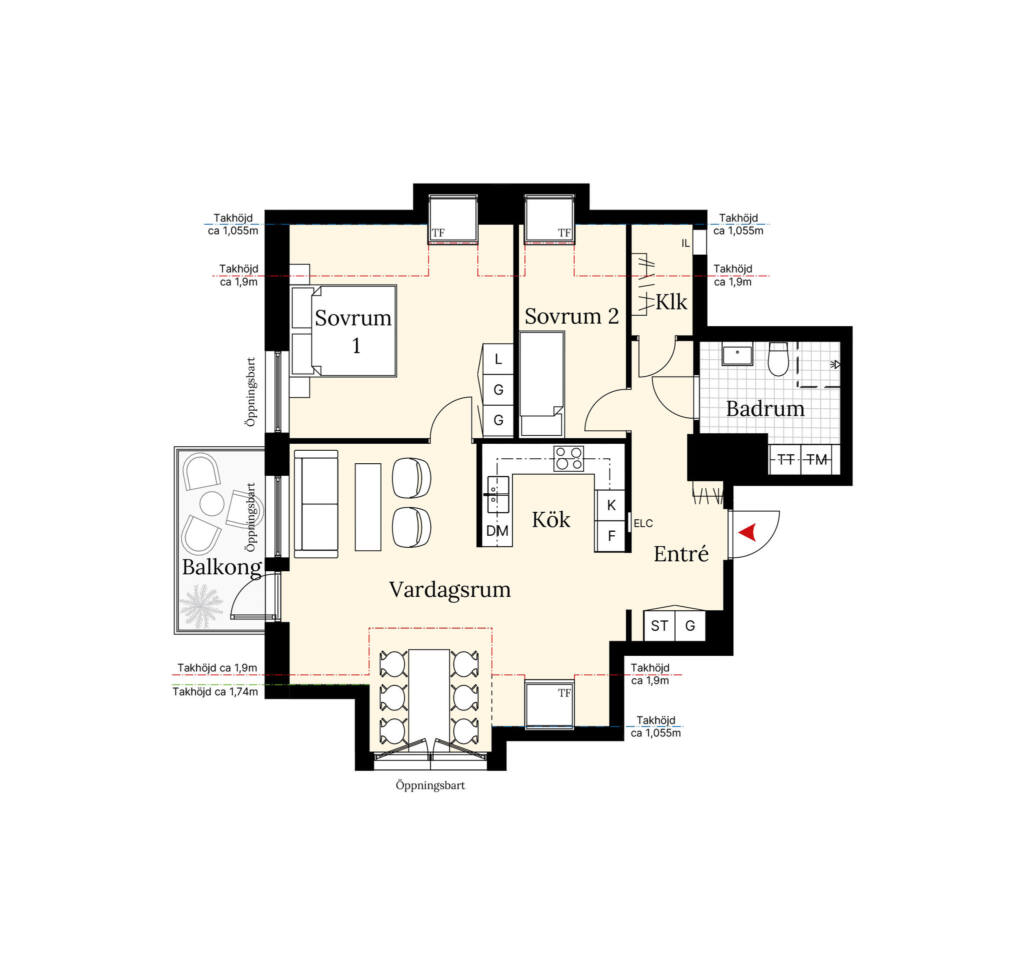 Denna vindstrea har luftiga ytor, en social planlösning och härligt ljusinsläpp från tre väderstreck. Dessutom gör vindsläget att du får takfönster som bidrar med både ljus och karaktär! När du öppnar dörren möts du av en entréhall med avhängning och förvaring i garderob och ett städskåp. Rakt fram öppnar hemmet upp sig i ett stort rum där kök, matplats och vardagsrum smälter samman.