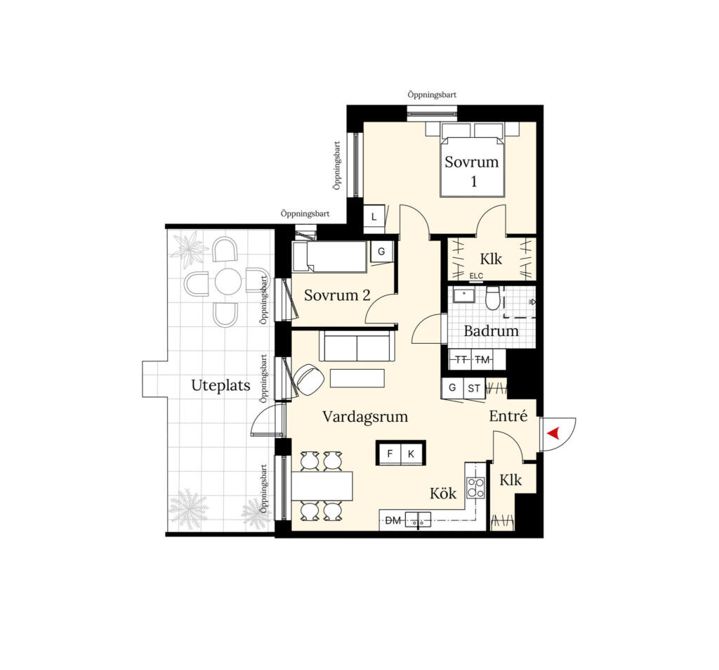 Från vardagsrumsdelen når du lägenhetens stora uteplats som har ett trevligt läge in mot gården. Här njuter du av avslappnade sommardagar, goda middagar och kanske egenodlade kryddor. Gårdsläget är också smidigt för dig som vill kunna ha uppsikt över lekande barn.