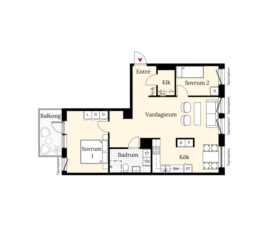Denna trea har luftiga ytor och en social planlösning. När du öppnar dörren möts du av en entréhall med avhängning och förvaring i klädkammare. Sedan öppnar hemmet upp sig i ett stort rum där kök, matplats och vardagsrum smälter samman i en halvöppen planlösning. Köket är utrustat med allt som ett modernt kök ska ha: kyl och frys i fullhöjd, diskmaskin, mikrovågsugn, spis med induktionshäll och varmluftsugn. Allt i ett stilrent vitt utförande. Köket är också utrustat med kolfilterfläkt.