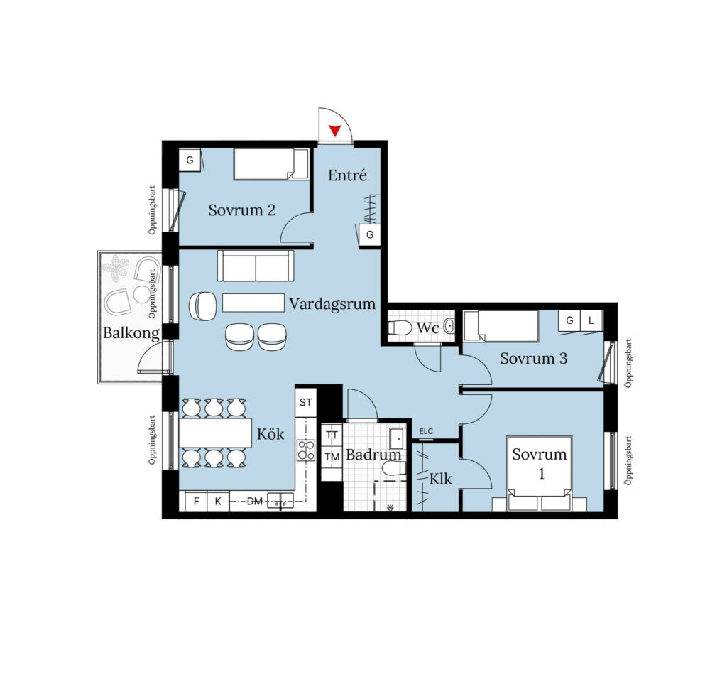 Denna fyra har luftiga ytor och en social planlösning. När du öppnar dörren möts du av en entréhall med avhängning och förvaring i garderob. Här ligger ett av lägenhetens sovrum som också har en garderob. Längre fram öppnar hemmet upp sig i ett stort rum där kök, matplats och vardagsrum smälter samman i en öppen planlösning.