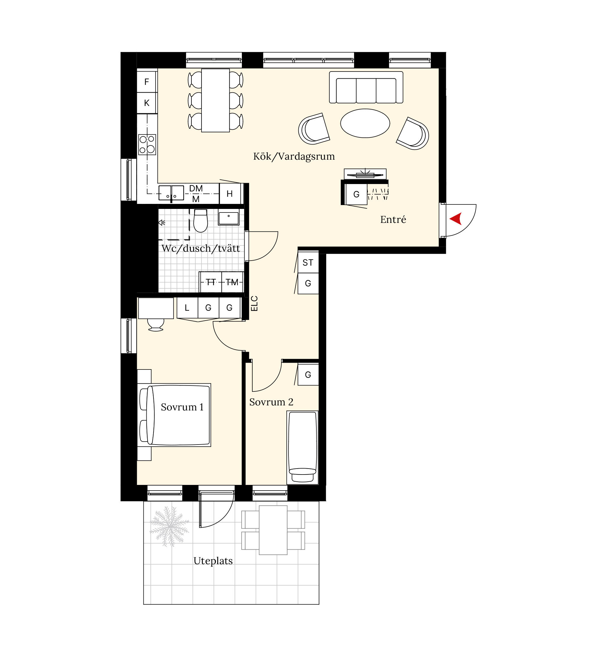 Denna lägenhet är uppdelad i en social och en privat del. Längst in lägenheten hittar du sovrummen som har ett avskilt läge i hemmet. Det stora har gott om plats för dubbelsängen och förvaring i två garderober och linneskåp. Härifrån når du också lägenhetens härliga uteplats, där det finns gott om utrymme för både odlingslåda och utemöbler. Det finns också ett mindre sovrum med garderob.