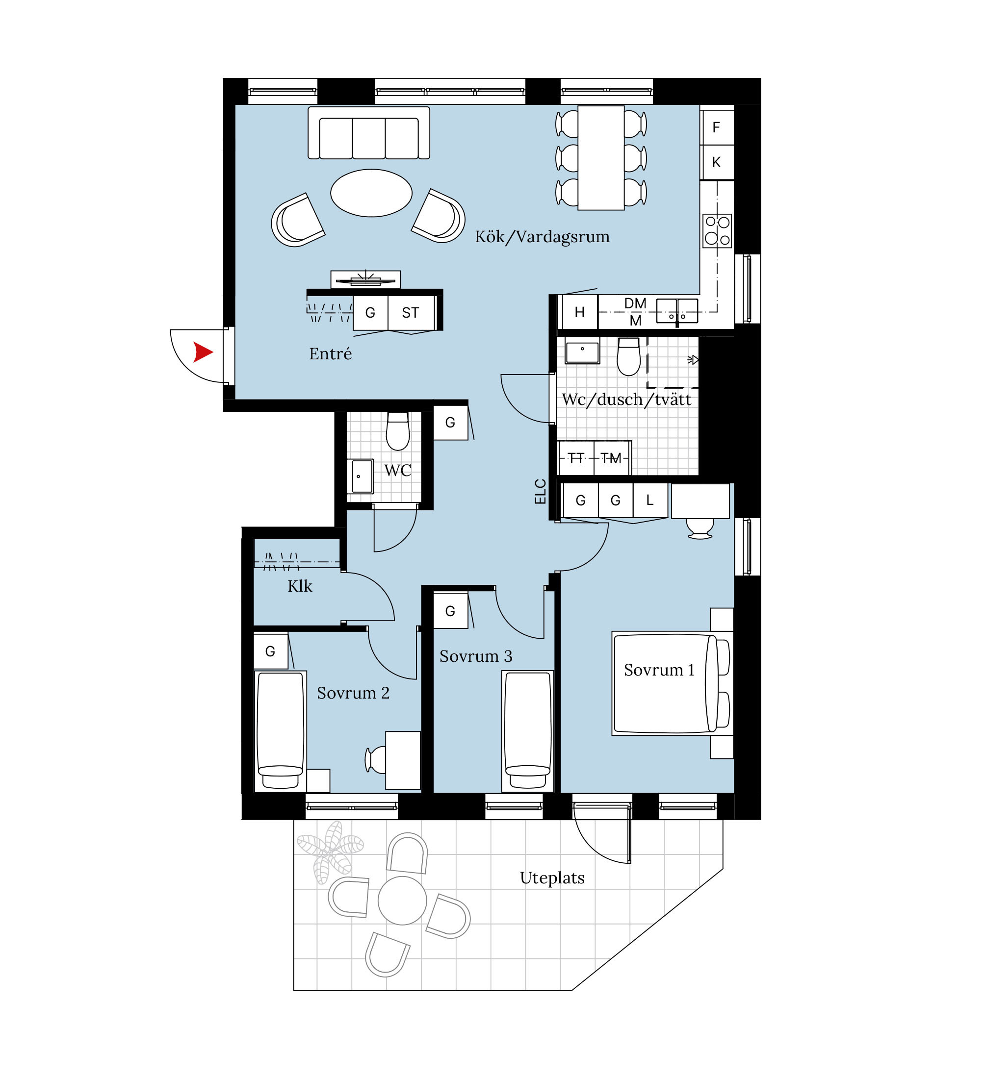 Alla sovrum har förvaring i garderober och i denna del av lägenheten finns även en klädkammare. Och inte minst en gästtoalett, som underlättar när alla ska göra sig i ordning samtidigt på morgonen!