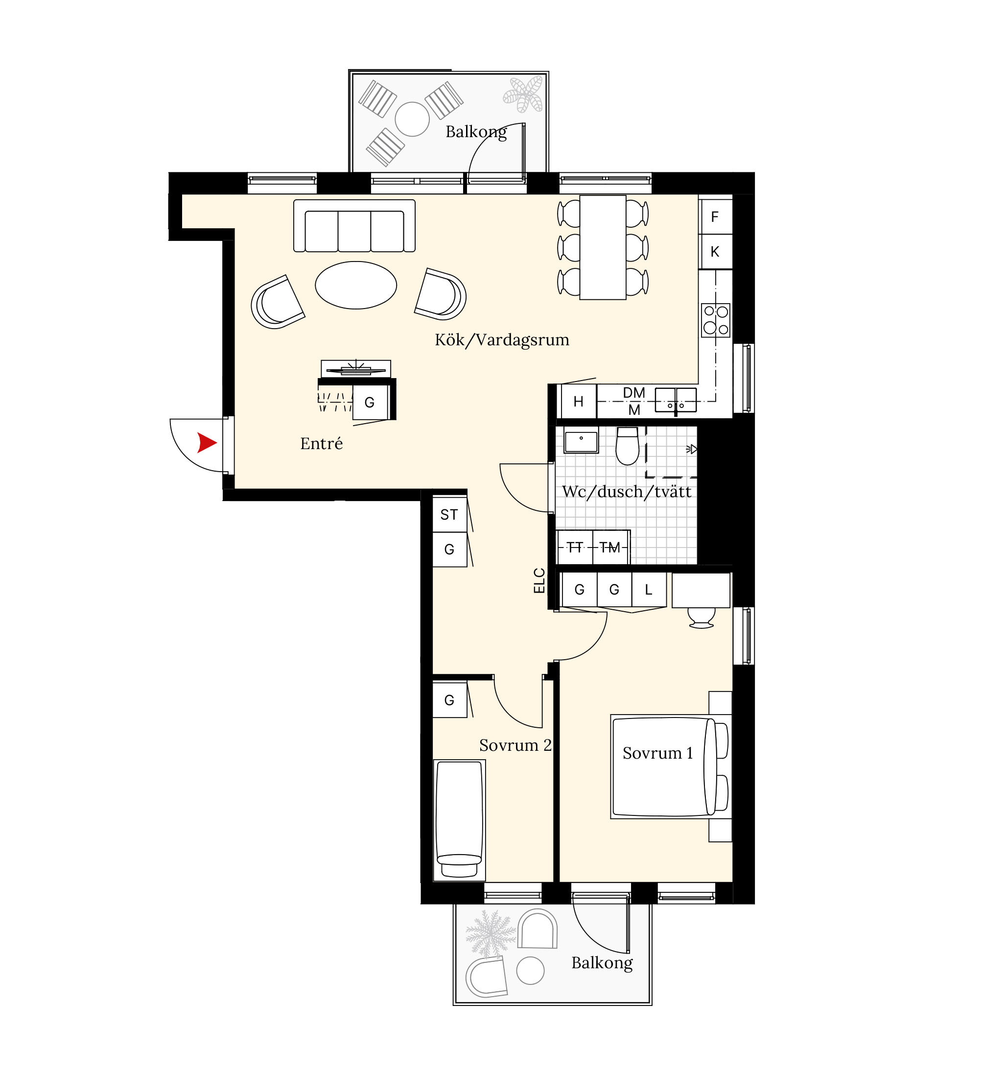När du kliver in möts du av en hall med generös förvaring och en avhängningsmöjlighet i form av en stilren kapphylla. Redan här känns den öppna planlösningen när hallen öppnar upp åt två håll och övergår till ett stort rum där kök och vardagsrum elegant smälter samman. Matplatsen är flexibel och enkel att anpassa efter antalet gäster vid större middagar. Från matplatsen når du den första balkongen som bjuder på nordostligt läge.