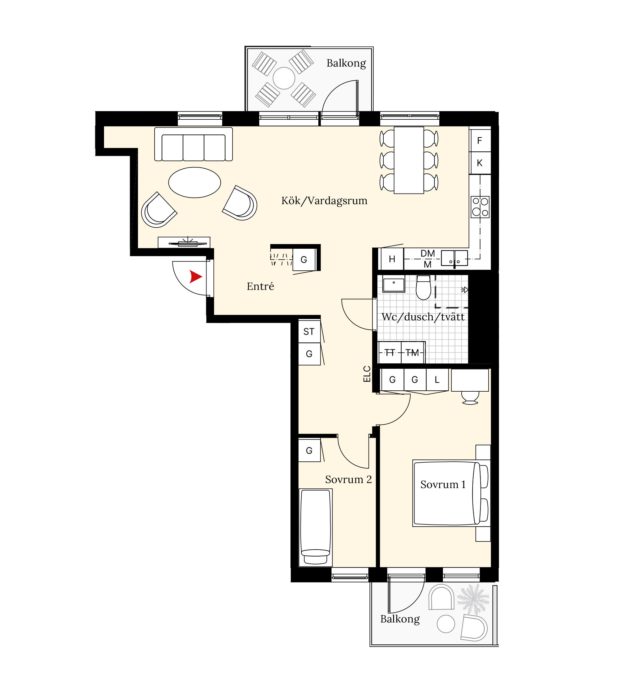 Denna charmiga bostadsrätt är omsorgsfullt planerad för att skapa ett trivsamt boende med varje detalj i åtanke. Den öppna planlösningen mellan kök och vardagsrum skapar en ljus och välkomnande atmosfär. Bostadsrätten har två balkonger som ger möjlighet till utomhusliv och njutning från olika håll.