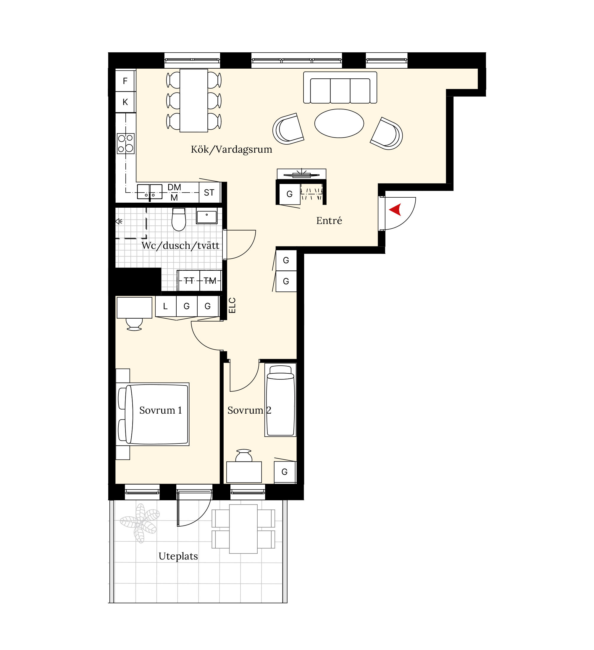 Denna bostad är intelligent uppdelad i en social och en privat sektion. Längst in i bostaden ligger sovrummen för en lugn atmosfär. Det stora sovrummet har generöst utrymme för en dubbelsäng och förvaring i två garderober samt linneskåp. Härifrån når du även bostadens härliga uteplats, perfekt för både odlingar och utemöbler. Det finns även ett mindre sovrum med egen garderob.