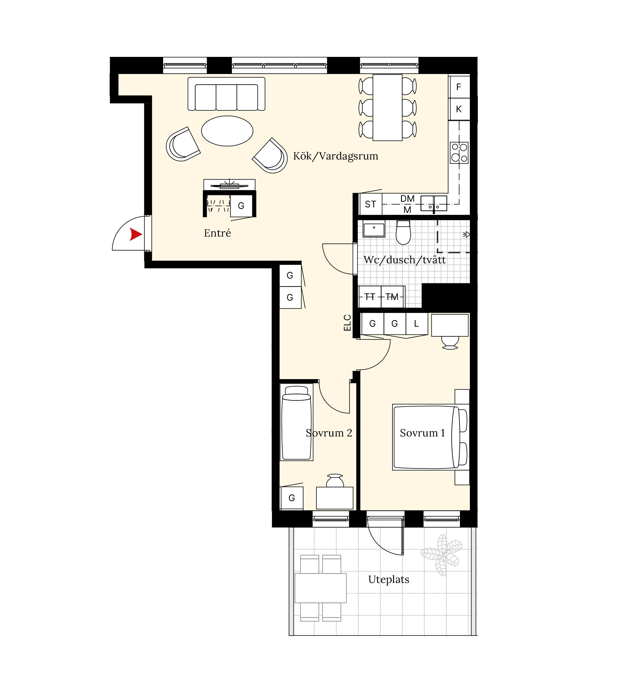 Längst in i bostaden hittar du sovrummen för en avskild atmosfär. Det stora sovrummet rymmer enkelt en dubbelsäng och erbjuder gott om förvaringsutrymme i två garderober samt linneskåp. Härifrån når du även den rymliga uteplatsen, perfekt för både grönsaksodlingar och utemöbler. Det finns även ett mindre sovrum med egen garderob.
