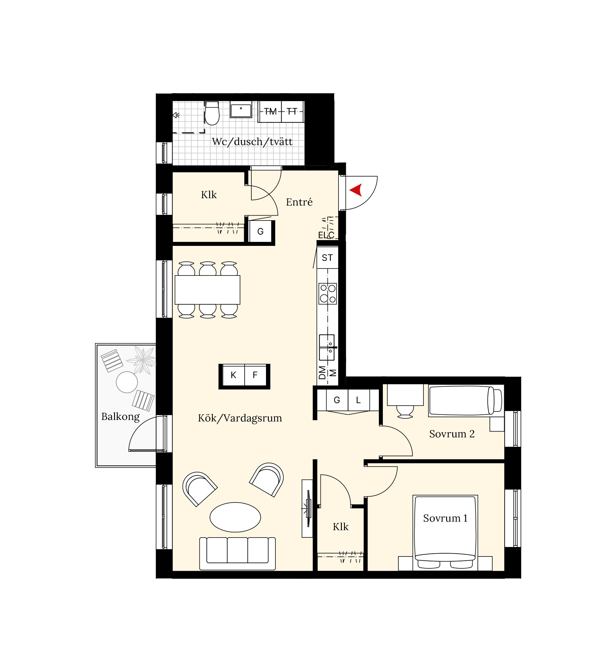Vardagsrumsdelen är luftig och har flera möbleringsmöjligheter. Härifrån har du också utgång till den rymliga balkongen, som med sitt västerläge blir en härlig förlängning av ditt hem. Här finns plats för både kryddodling och sittmöbler.