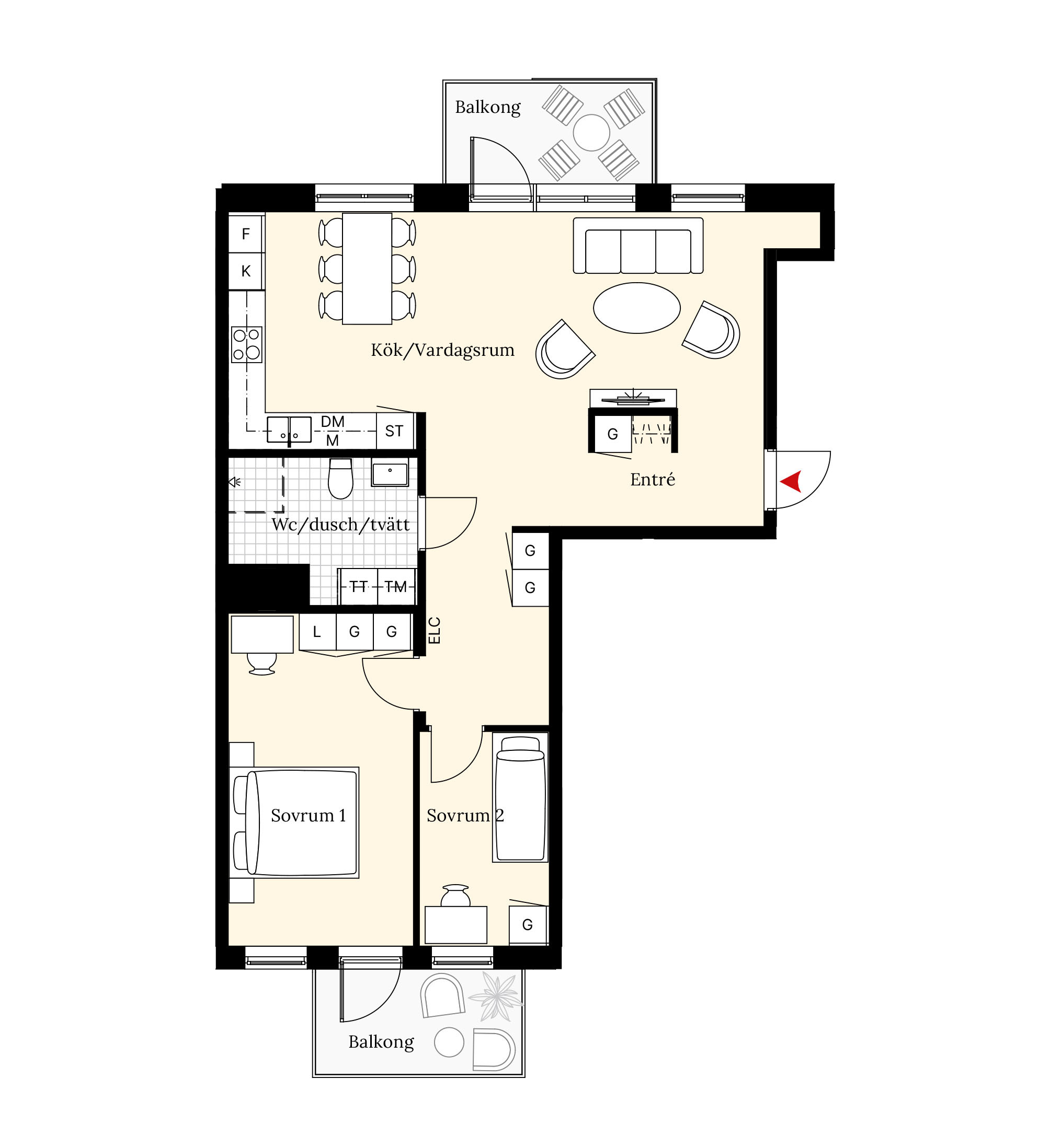 Köket är en funktionell höjdpunkt i hemmet. Vita köksluckor, vitt kakel och en grå bänkskiva i laminat skapar en enhetlig och stilfull atmosfär. Här finns allt du behöver, från diskmaskin och induktionshäll till varmluftsugn, mikrovågsugn och kyl/frys i fullhöjd – allt i en enhetlig och modern vitt utförande. Från matplatsen når du den första balkongen, smart placerad mot nordost för att fånga morgonsolens strålar.