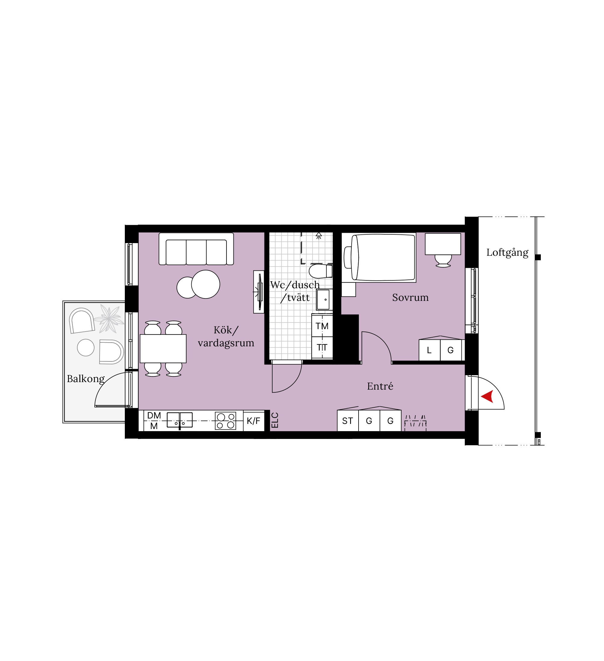 Denna tvåa nås från en loftgång. När du kommer in i lägenheten möts du av avhängning i form av en kapphylla och förvaring i två garderober och ett linneskåp. Till höger ligger lägenhetens sovrum, som har ett lugnt gårdsläge och är utrustat med ytterligare garderob och linneskåp.