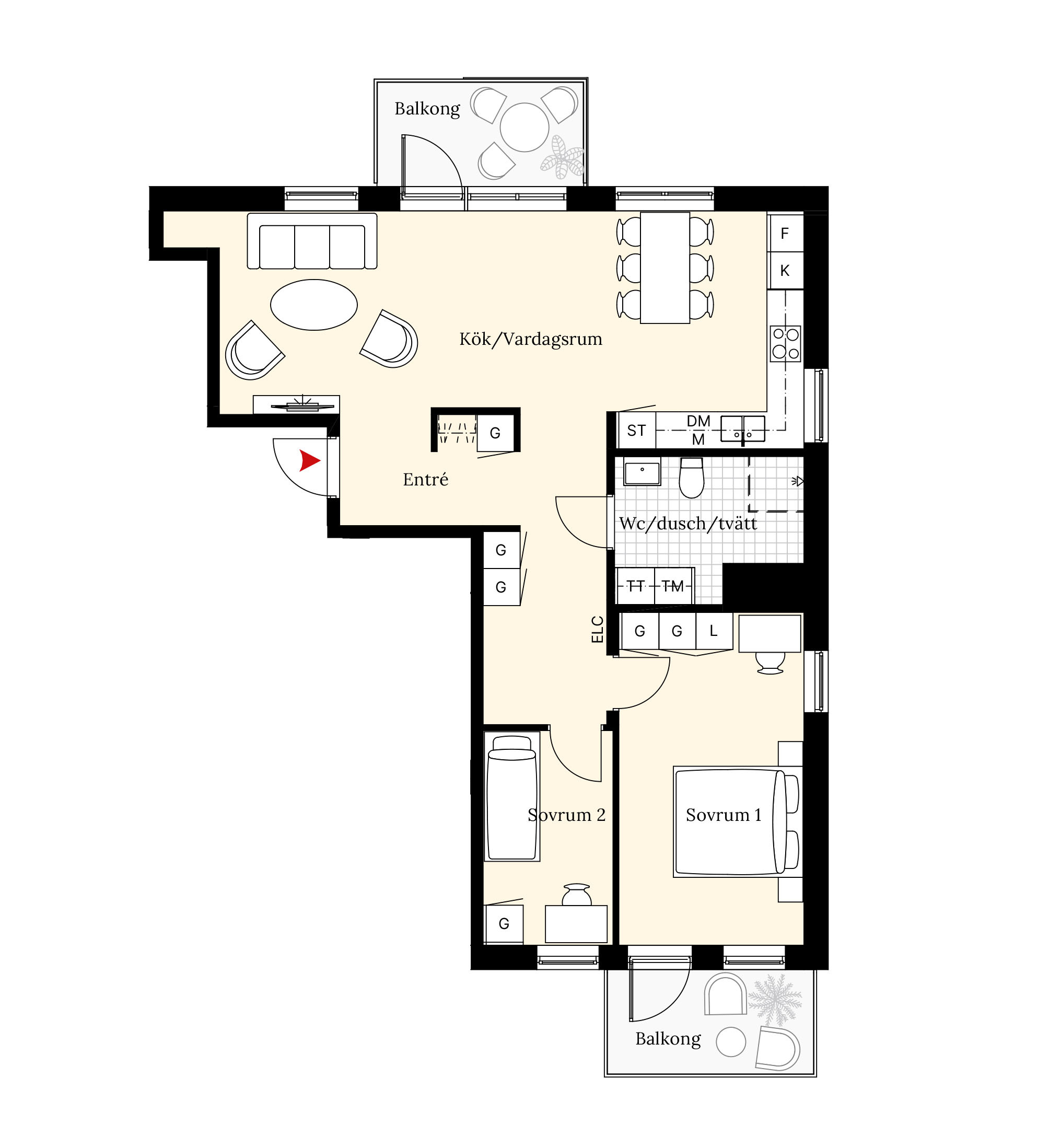 Bostaden är genomtänkt indelad i en social och en privat del. En inre hall leder dig till det rymliga badrummet, där vitt kakel på väggarna, grå klinker på golvet och en dusch med klarglasväggar skapar en modern atmosfär. Tvättmaskin och torktumlare har sin plats här, och en praktisk bänkskiva med skåp ovanför ger extra förvaring. Sovrummen, belägna längst in i lägenheten, skapar en privat reträtt. Det stora sovrummet har plats för en dubbelsäng och generös förvaring i två garderober och linneskåp. Den andra balkongen, i sydvästläge, blir din personliga oas för att njuta av kvällssolen. Här finns också ett mindre sovrum med en tillhörande garderob.